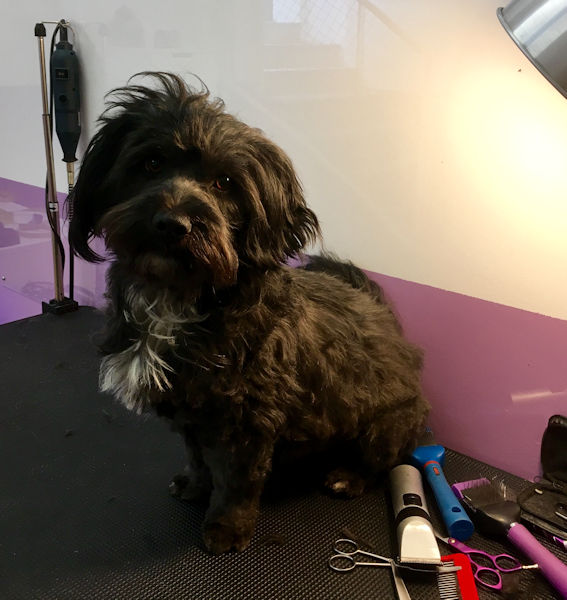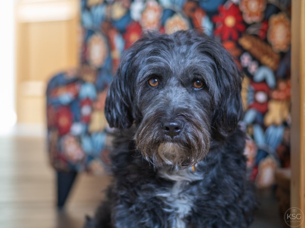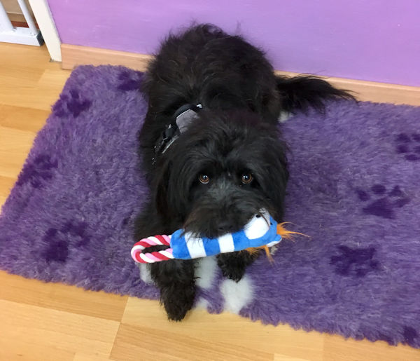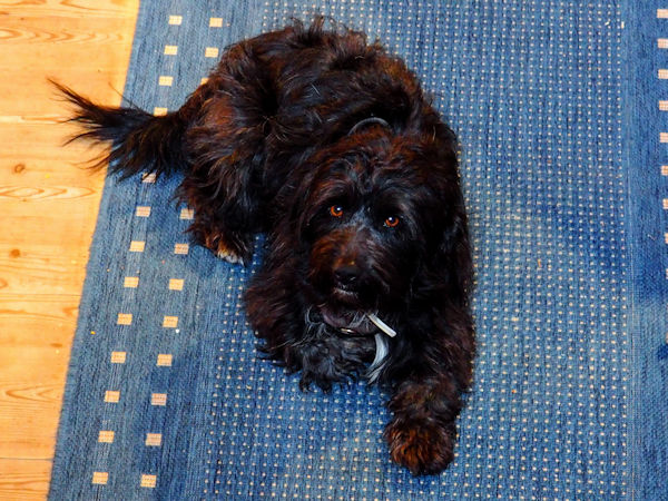 Mit Clicker hat er Sitz sehr schnell gelernt, und er reagiert auf seinen Namen, auf der Spielwiese kann ich ihn mit hinter ihm herschleppender langer Leine auch mal los lassen, er läuft dann eigentlich nicht weit von mir und kommt auch, wenn man ihn ruft, zumindest, wenn er sich davon ein Leckerli erwartet 😉 und nicht gerade im wilden Spiel mit einem anderen Hund ist. Den Maulkorb lässt er sich anlegen und hat offenbar verstanden, dass er den in öffentlichen Verkehrsmitteln an haben muss – Bus und Straßenbahn und U-Bahn haben wir bereits erprobt, er hat damit keine Probleme. Er ist auch zu 99% stubenrein, wenn man von einem sehr gelegentlichen Markierverhalten absieht, lässt sich wunderbar an der Leine führen (wir üben, dass er warten muss, sobald ein Zug drauf ist, das klappt noch nicht 100%, aber das wird auch schon besser – vor allem dreht er sich dann jedes Mal zu mir um und schaut, was los ist). Unsere Papageien würde er sehr gerne jagen, da muss man aufpassen, aber das wird sich schon irgendwann legen, denke ich.