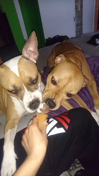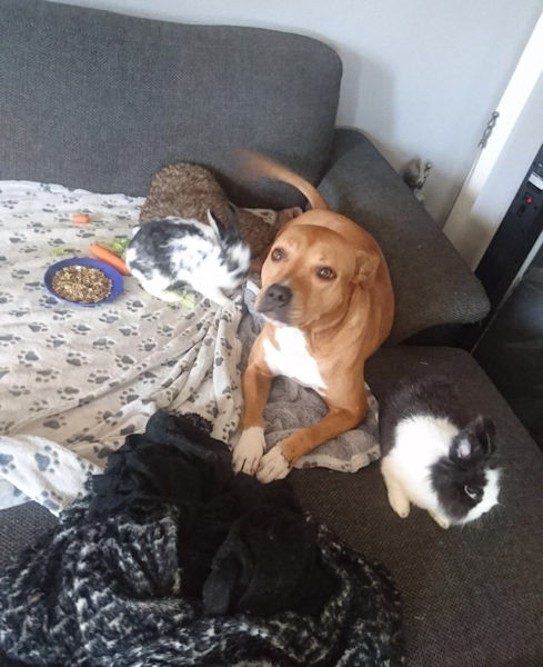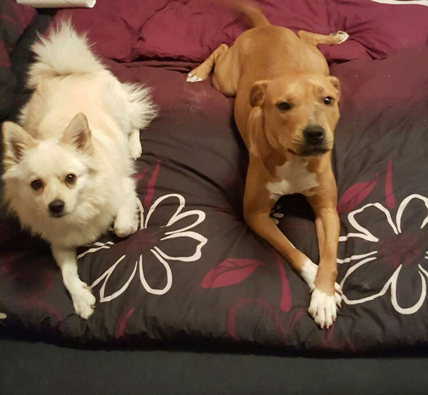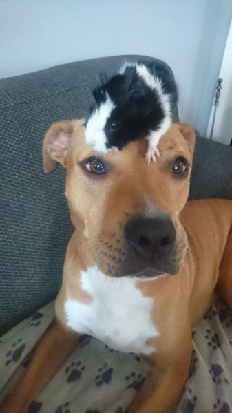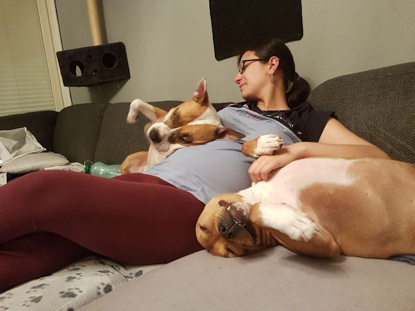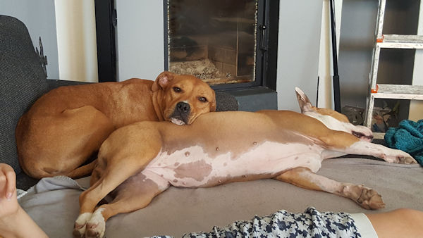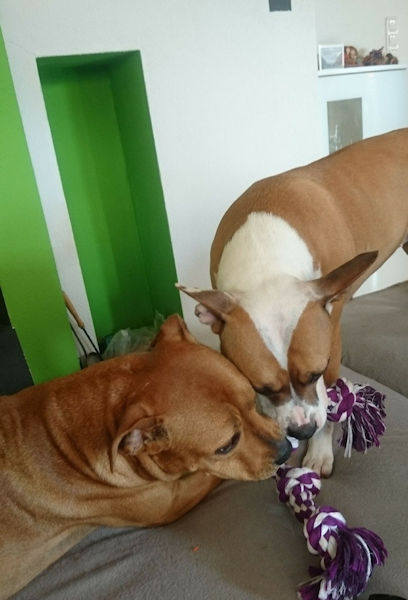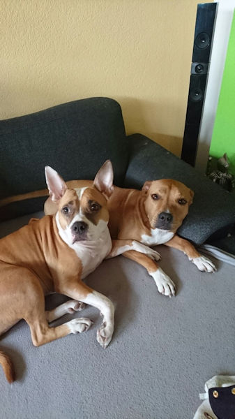 ich hoffe, dir geht es gut. Ich dachte mir, ich melde mich wieder mal und schicke dir ein paar aktuelle Fotos von Josy. Zumal es ja genau 1 Jahr her ist, als ich die Süße von euch übernommen habe. In der Zwischenzeit ist ziemlich viel passiert bei uns. Meine Freundin ist mit ihrer Hündin, 3 Katzen, Meerschweinchen und Hasen von W. zu mir gezogen. Ihre Hündin heißt Kiana und ist ebenfalls ein Amstaff. Mittlerweile sind sie unzertrennlich, und wie du auf den Fotos siehst, kuscheln sie bei jeder Gelegenheit zusammen… so süß. Josy geht es prächtig und ich bin überglücklich, dass ich sie habe.