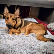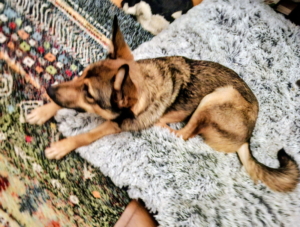 Sie bleibt brav mit den anderen Hunden des Pflegerudels zu Hause, aber ganz Junghund bleibt dabei nicht jeder Polster im Originalzustand, im Großen und Ganzen benimmt sie sich aber gut. Sie schläft die Nacht durch und ist stubenrein.