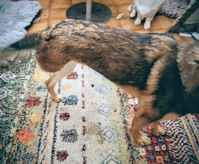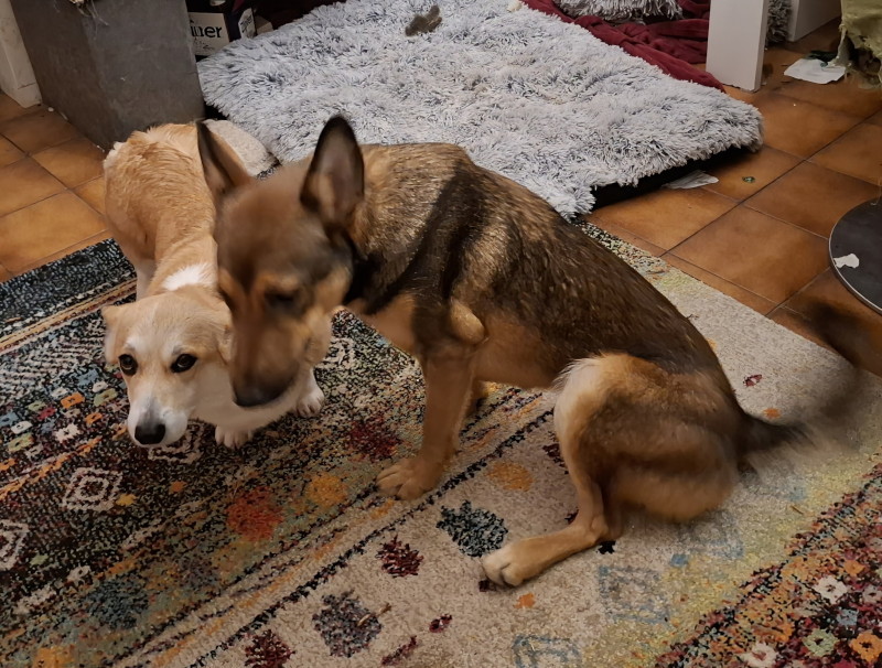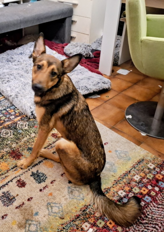 Sie bleibt brav mit den anderen Hunden des Pflegerudels zu Hause, aber ganz Junghund bleibt dabei nicht jeder Polster im Originalzustand, im Großen und Ganzen benimmt sie sich aber gut. Sie schläft die Nacht durch und ist stubenrein.