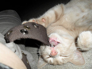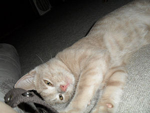 ich kann mich noch erinnern, dass er dann fürs erste gespielt hat und herumgetobt ist dabei hat er ganz komische töne von sich gegeben. von anfang an hab ich ihn lieb gehabt und als er dann schmusen kam, wäre selbst ein eisberg zerflossen. das hat er heute noch, seinen kopf ganz eng an meinen hals gepresst, das mäulchen vergraben kann er schnurren und kriegt nicht genug davon. er hat aber auch serbisches blut, so kann er sehr zornig werden wenn er schmusen will und ich grade nicht kann. dann beisst er mich und pfaucht mich schon auch mal an. er kann ein richtig wilder und ein ganz sanfter sein, ich habe schon viel spass mit ihm gehabt und tränen gelacht, wenn er seine wilden minuten hat, oder ein stangerl in den mund nimmt und sich damit rasend schnell im kreis dreht.