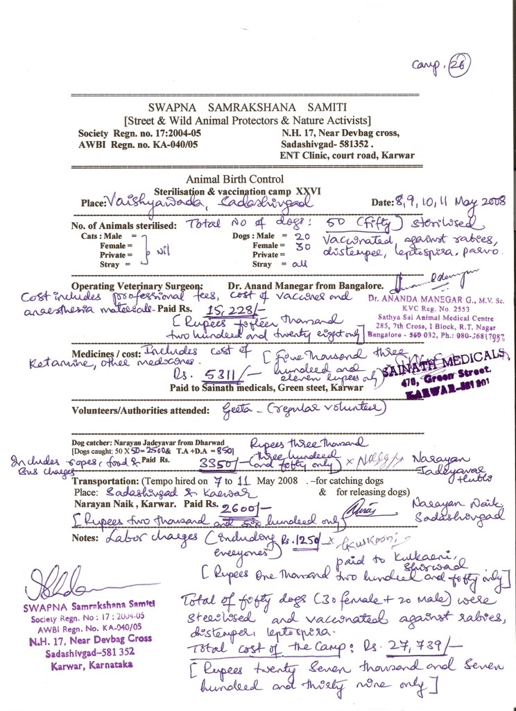 Frau Dr. Asha Kadam ist eine HNO-Ärztin mit Wohnsitz in Sadashivgad, Karwar, im Südwesten Indiens. Als junges Mädchen musste sie mit ansehen, wie ein großer Rüde auf brutale Weise von Ortsbewohnern zwischen zwei Baumstämmen buchstäblich zermalmt wurde. Seit damals hat sie sich unermüdlich dafür eingesetzt, den unzähligen Straßenhunden und -katzen in Indien zu helfen. Ihre Hauptarbeit besteht darin, Sterilisierungscamps zu organisieren, die oft unter sehr ärmlichen Bedingungen stattfinden. Asha Kadam gründete 2003 ihre eigene bescheidene Tierschutzorganisation "SWAPNA samrakshana samiti" (ein Akronym für Street and Wild Animal Protectors and Nature Activists). SWAPNA wurde 2004 behördlich eingetragen und 2005 von der Indischen Tierschutzbehörde anerkannt. Der Wirkungsbereich von SWAPNA ist der Bezirk Uttara-Kannada im Staate Karnataka mit einer Größe von 10.291 km2. Nach einer 2003 durchgeführten Zählung beläuft sich die Gesamtanzahl von Straßenhunden in dem Gebiet auf über 105.500. Das Hauptziel von SWAPNA besteht darin, 100.000 Straßenhunde zu sterilisieren. In diesem Küstengebiet gibt es auch unzählige Straßenkatzen, deren Anzahl ebenfalls durch das Sterilisierungsprogramm von SWAPNA herabgesetzt werden soll. In einem Brief an Carol Byers, Gründungsmitglied von Animal Care International, beschreibt Dr. Kadam die schwierige Situation folgendermaßen: | |||||||||||||||||||||||||||||||||||||||||||||||||||||||||||||||||||||||||||||||||||||||||||||||||||||||||||||||||||||||||||||||||||||||||||||||||||||||||||||||||||||||||||||||||||||||||||||||||||||||||||||||||||||||||||||||||||||||||||||||||||||||||||||||||||||||||||||||||||||||||||||||||||||||||||||||||||||||||||||||||||||||||||||||||||||||||||||||||||||||||||||||||||||||||||||||||||||||||||||||||||||||||||||||||||||||||||||||||||||||||||||||||||||||||||||||||||||||||||||||||