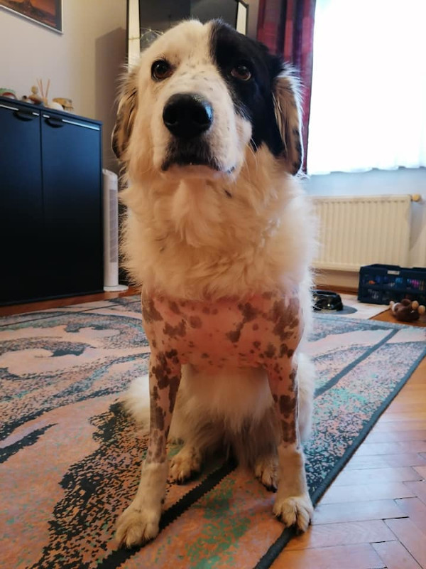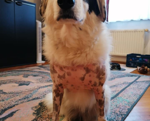 Weißt du, liebe Patentante, mit der Gesundheit hab ich es leider nicht so gut erwischt. Die Steine in meiner Blase haben wir sehr gut unter Kontrolle, aber leider habe ich auch eine Staub- Milben- und Gräserallergie. Da bekomme ich, wenn’s ganz schlimm ist, immer so doofe Tabletten, die ich nicht fressen mag! Naja, sie helfen zumindest ein bisschen. Und weißt du, was ganz schlimm ist? Ich hab Arthrose in beiden Ellbogengelenken und auch eine Ellbogendysplasie! Ich musste deshalb im November operiert werden, weil  lauter abgebrochene Knorpelteile in meinen Gelenken herum geschwommen sind. Kannst du dir vorstellen, was das für Schmerzen waren, weil solange keiner die richtige Diagnose gestellt hat, ich immer wieder lahmte, und immer so tapfer beim Tierarzt war und keine Schmerzen gezeigt habe, wenn der überall herumgedrückt hat? Aber meine Mami hat nicht locker gelassen, bis wir endlich bei einem Tierarzt waren, der mir geholfen hat. Und auf meiner linken Seite ist der Knochen der Speiche höher gewachsen, als die Elle, sagt der Tierarzt. Aber das beobachten wir jetzt mal, weil sonst müsste der Knochen gekürzt werden und das mag ich gar nicht, und meine Mami auch nicht. Jetzt ist zum Glück mal alles von der Operation verheilt und mein Fell ist auch schon wieder nachgewachsen. Nackig haben sie mich geschoren, und dann hat mich meine Mami angezogen, weil es so kalt war – ich sag dir, das war ganz dooof, mit den Klamotten Gassi gehen.