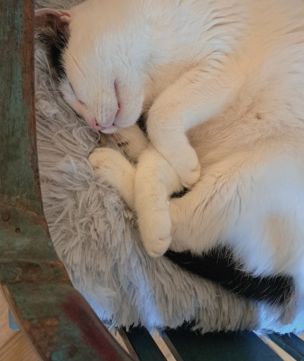 Am Sonntagabend haben die Zwei sich dann ohne Gitter kennengelernt. Und wie schon gesagt, läuft es mit der Annäherung ziemlich gut. Embra hat sich zwar auf den ersten Erkundungstouren ein paar Watschen eingefangen, als sie ungefragt Silvesters Lieblingsplätze inspiziert hat (und geht seitdem deutlich vorsichtiger mit dem Kater um), er lässt sie aber immer näher an sich herankommen, und mittlerweile liegen und schlafen beide ganz selbstverständlich und stressfrei im selben Raum. Für Tag 4 ist das denke ich ein sehr guter Stand!