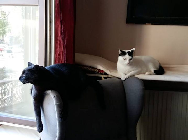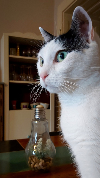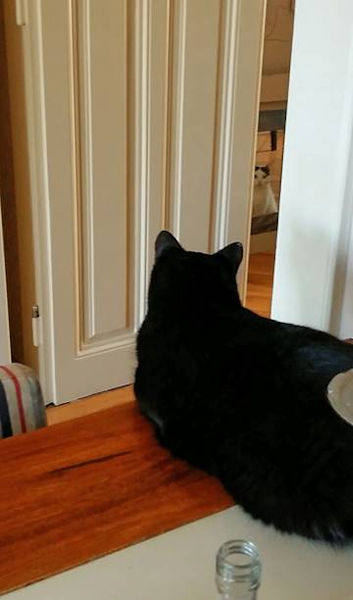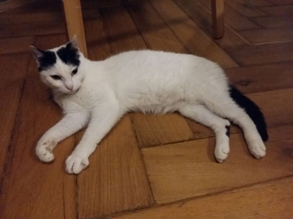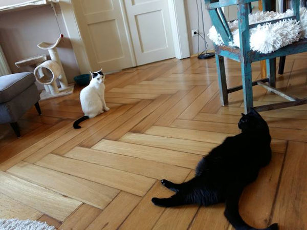 Silvester war am Anfang recht überfordert und wusste so gar nicht, was los war, als die neue Mitbewohnerin auf einmal im Nebenzimmer saß (er ist geschlagene 3 Stunden lang flach wie ein Krokodil bei Bombenalarm durch die Wohnung gekrochen). Mittlerweile hat er sich aber daran gewöhnt, dass da nun noch jemand ist und verhält sich immer entspannter in ihrer Gegenwart.