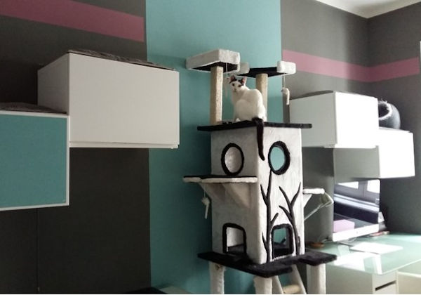 Die kleine Maus selbst hatte zu Beginn ja gar keine Berührungsängste und war von Tag eins an absolut angstfrei und anhänglich. Ich habe tatsächlich noch nie eine so bezaubernde Schmusemaus kennengelernt. Von Befangenheit angesichts der neuen Umgebung war da auch keine Spur, und am liebsten hätte sie sofort die gesamte Wohnung inspiziert und in Beschlag genommen. Aber um unseren Altkater mit der neuen Mitbewohnerin nicht zu sehr zu schockieren, hatten wir sie in den ersten 1,5 Tagen zunächst im Arbeitszimmer einquartiert. Dies hat sich insofern angeboten, als dass wir hier unsere Hängekästen ohnehin als Liege- und Kletterflächen mit eingeplant hatten. Der Raum ist auch jetzt noch ihr“ Zimmer, und da der behäbige Kater die Kletteranlage nicht mehr nutzt, hat die Kleine Embra gleichzeitig einen privaten Rückzugsort hat, der nur ihr gehört.
