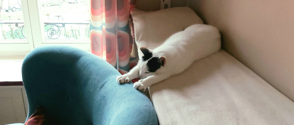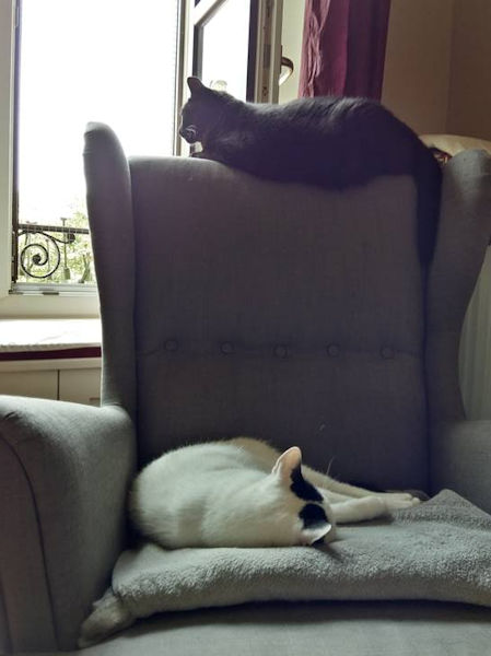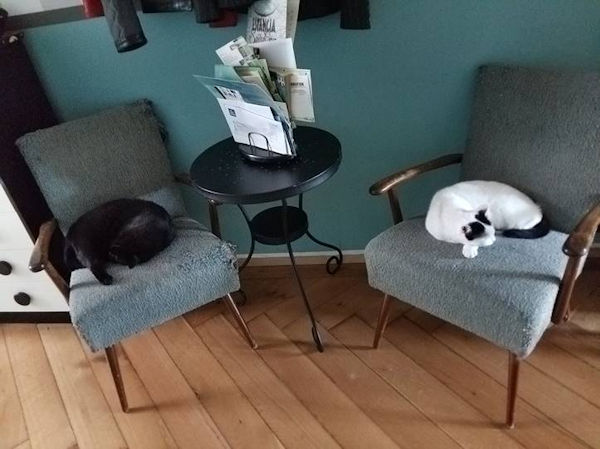 Am Sonntagabend haben die Zwei sich dann ohne Gitter kennengelernt. Und wie schon gesagt, läuft es mit der Annäherung ziemlich gut. Embra hat sich zwar auf den ersten Erkundungstouren ein paar Watschen eingefangen, als sie ungefragt Silvesters Lieblingsplätze inspiziert hat (und geht seitdem deutlich vorsichtiger mit dem Kater um), er lässt sie aber immer näher an sich herankommen, und mittlerweile liegen und schlafen beide ganz selbstverständlich und stressfrei im selben Raum. Für Tag 4 ist das denke ich ein sehr guter Stand!
