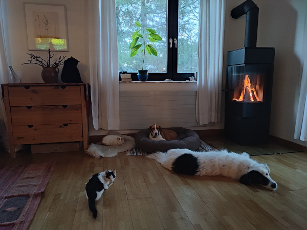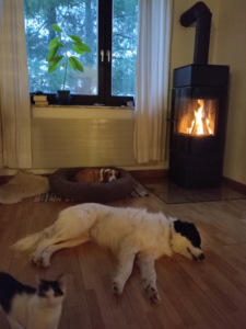 Anbei ein Foto von den beiden Schätzen auf ihrem Lieblingsplatzerl vor dem Ofen 🙂 (das auch die Katzen sehr genießen..)