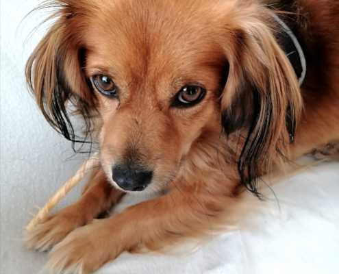 Sie gehört jetzt zu „meinem Rudel“, stell dir vor! Sie ist eine sehr Ruhige, die nicht gerne spielt so wie ich, aber sie ist nett!