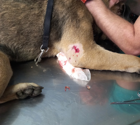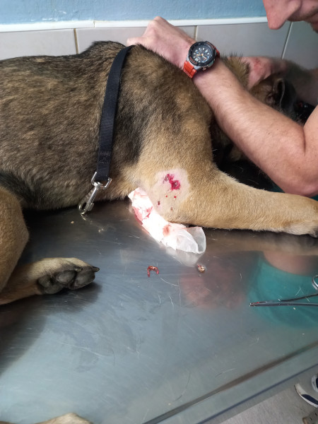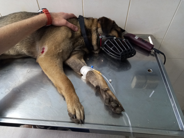 Sofort machten sich Nina, ihr Mann und der arme Kerl auf den Weg zum nächsten Tierarzt, doch 50m davor brach der Hundemann zusammen. Er konnte einfach nicht mehr…hatte hohes Fieber, eine bereits beginnende Sepsis, und es wäre nur eine Frage der Zeit gewesen, bis er gestorben wäre. Seine Bisswunden an den Beinen waren stark angeschwollen, und es