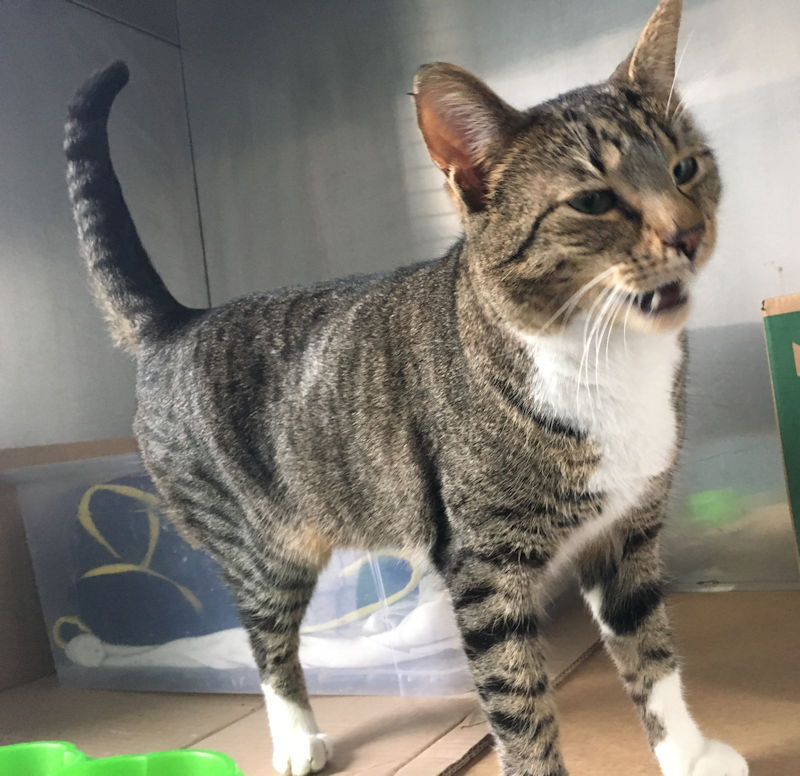Das arme Tier wurde mit einem herabhängenden Hinterbein gefunden. Leider gab es keine Möglichkeit mehr, das Bein zu retten – es musste amputiert werden. Inzwischen hat TOMICA sich von dieser schweren Operation völlig erholt, und er kommt sehr gut mit seiner Behinderung zurecht.