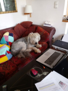 Am Mittwoch hat er einen Termin beim Hundefrisör, da kommt ein Teil der Wolle weg. In der Arbeit war er auch schon mit, das klappt gut.