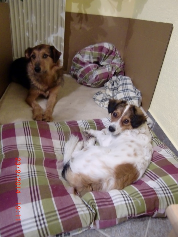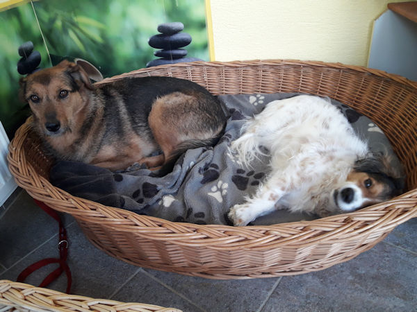 Anbei Fotos: Beide im Körbchen, wird schon langsam, Samu wird immer mehr bewusst – ICH bin hier NICHT der CHEF, funktioniert schon sehr gut.