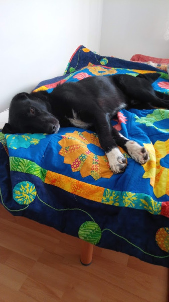 Teddy ist jetzt seit genau einer Woche daheim, und fühlt sich schon richtig wohl hier. Die Hundebetten ignoriert er noch immer, dafür hat er sich einen ‚Menschenpolster‘ ausgesucht auf/neben den er sich legt, und den er mit Begeisterung abschleckt. Er geht super an der Leine und hat auch schon eine Lieblingswiese, in der er sich jedes Mal genüsslich wälzt, wenn wir vorbeikommen. Außerdem ist es ihm absolut wurscht, dass er für einen Schoßhund viel zu groß ist, er setzt sich immer wieder gerne auf mich drauf :-).