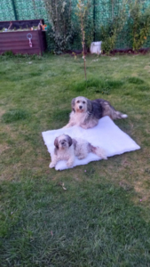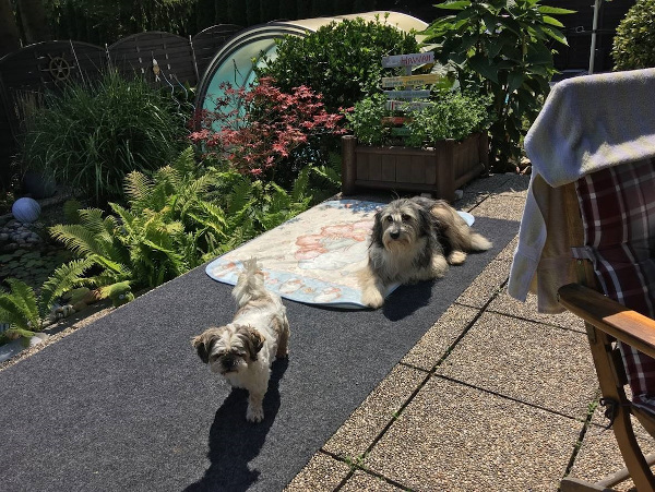 Am Foto siehst Du unsere Lieblinge – ein unschlagbares Team und die besten Freunde – vom ersten Tag an. Wir sind alle gesund und munter und genießen den Sommeranfang im Garten, am Pool und bei langen Spaziergängen im kühlen Wald.